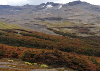 Durante alrededor de 3 horas fuimos ganando elevación por terrazas de uno de los valles que tienen su origen en el cordón montañoso al cual nos dirigimos, hasta llegar a la zona de campamento, donde ya se podían apreciar otros pequeños glaciares de circo, forma semicircular en la parte superior de un glaciar. Los ejemplares de lenga, coigüe y ñirre cedieron su lugar a las montañas, terrenos más escarpados de roca, una vegetación dominada por el desierto andino, y una gran vista del macizo Paine al noreste de nuestra locación.
