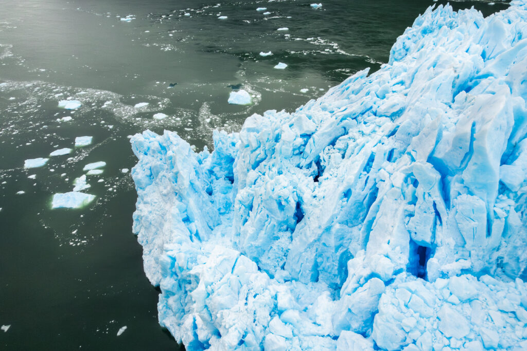 Trozos de hielo en el frente del glaciar San Rafael, asociados a los procesos de retroceso y fragmentación del glaciar. Fotografía: David Cossio