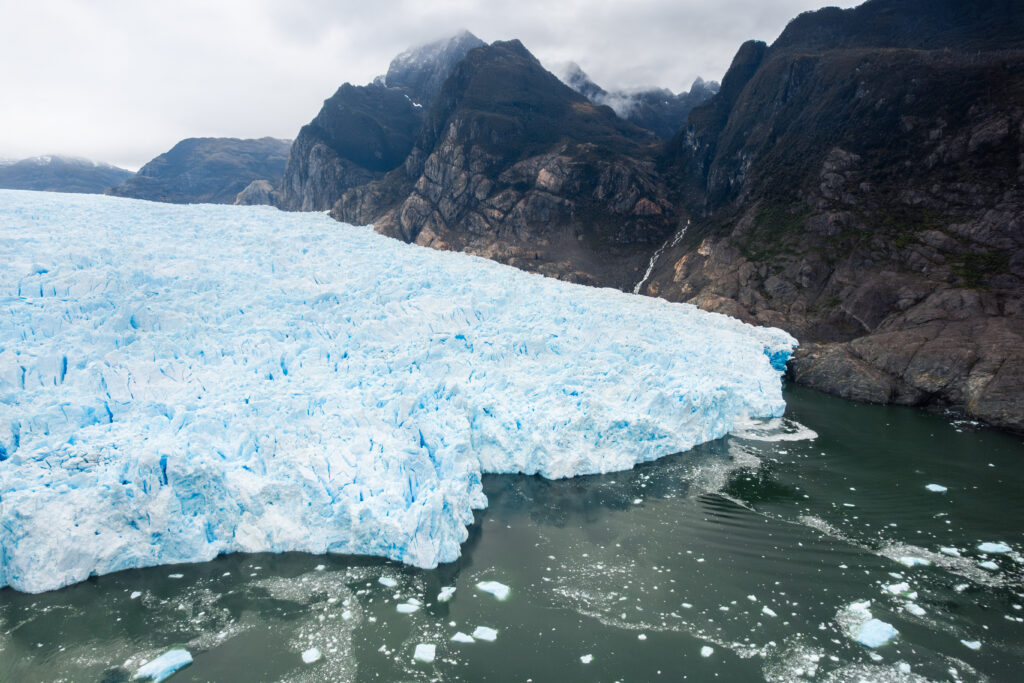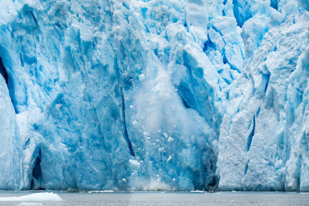 Desprendimiento de hielo en el glaciar San Rafael, una señal visible del acelerado retroceso del glaciar. Fotografía: David Cossio