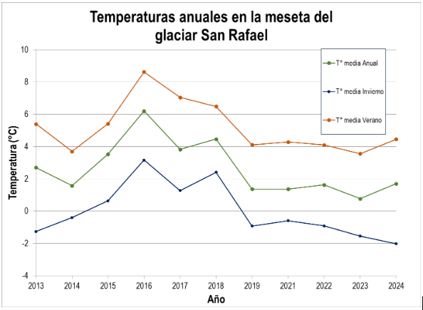 Finalmente, la media anual se mantiene en valores positivos durante todo el intervalo, con un promedio de 2,65 °C. Esto representa un escenario crítico para la estabilidad del hielo glaciar, puesto que la mayor parte del tiempo el glaciar San Rafael en su zona de acumulación está experimentando temperaturas que favorecen la fusión y sublimación del hielo, en lugar de conservar y recongelar el hielo y la nieve que aporta masa para mantener la dinámica del glaciar.