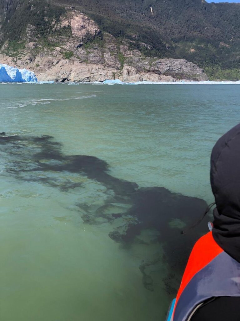Estela oscura visible en las aguas de la Laguna San Rafael, región de Aysén, área protegida de alta sensibilidad ambiental donde se investiga el derrame de combustible.
